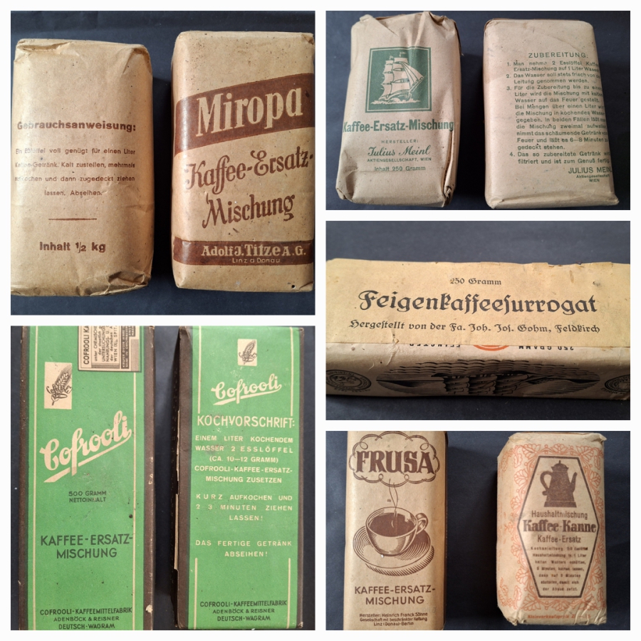 Weitere Rohstoffe lieferten Kastanien, Löwenzahnwurzeln, Kerne und Steine von Früchten, Eicheln, Erdmandeln, Kartoffeln, Buchecker, Kichererbsen, Rüben, Kaffeewicke, Spargel ... Im 19. und 20. Jahrhundert gab es eine Vielzahl von Firmen, die Ersatz- und Zusatzkaffee herstellten und vertrieben: Linde, Titze, Kathreiner, Franck, Imperial, Oberlindober, Andre Hofer, Wenger, Reindorf, Seelig, LOB, Gohm, Meinl, Cofrooli ... siehe unter den entsprechenden Rubriken. Originalpackungen sind immer wieder zu bekommen. Aktuell vertreibt die Firma Naturata einige lösliche Ersatzkaffeesorten, die im Figurenmuseum angeboten werden.