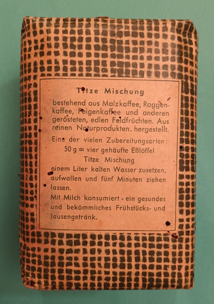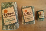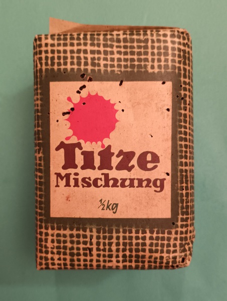 Es gibt verschiedene Kennungen: Pickerl mit schwarzer Schrift auf weißem Grund und dem bekannten Klecks als I-Punkt, gegossene und gebrannte Titze-Schriftzüge, Werbegeschenke hatten verschiedenste Kennungen ... Wie für Linde gilt: nur Beigaben mit (gut erhaltenen) Kennungen sind für den Sammler interessant. Originalpackungen mit vermeintlichem Inhalt sind extreme Raritäten. Hier eine 500, 250 und 80 Gramm Packung.