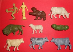 Tierserien mit Pickerl: Pferde, Raubkatzen, Kamele, Bisons, Esel, Nashorn, Nilpferd, Elefant ... Die Pferde, Bisons und Bären gibt es in reinweiß, weiß, hellbrau, dunkelbraun, braungrün und grün. Die Bärenserie mit schönem Pickerl in weiß. Die drei kleinen Bären im Vordergrund sind recht selten, in braun mit Pickerl echte Raritäten. Die Wildtierserie (Esel, Elefant, Flusspferd und Nashorn) gibt es in weiß und grau. Die vier Raubkatzen kenne ich in weiß und dunkelbraun, die Kamele in weiß und in verschiedenen Brauntönen. Sehr selten sind braune Tiere (Kuh, Pferd ...) mit Pickerl - siehe letzte Reihe. Diese kenne ich ungemarkt und mit Heißprägung von Morli.