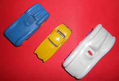 Es gibt die kleinen Segelboote in vier Variationen. Diese spröden und dünnen Hartplastikboote sind bis auf die Farben ident, tragen an der Unterseite die Kennung und unterscheiden sich durch die Form des Segels. Transparente und marmorierte Varianten kommen vor. Selten, da oft beschädigt (gebrochene Segelmasten). Rechts in der zweiten Reihe ein Kanu mit Heißprägung.