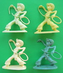 20.09.2013: Den kleinen Cowboy - mit oft gerissenem Lasso - habe ich bisher immer Panchito genannt. Im Internet ist diese Figur aber eindeutig als Pecos Bill zu identifizieren. Auch auf den Bodenkärtchen wird sein Name mit Pecos Bill angegeben. Von dieser Figur, die es mit Pickerl und mit Prägung gibt, scheint es besonders viele Farbvarianten zu geben. Siehe hier Gelb- und Grüntöne.