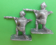 11.08.2014: Die Science Fiction Figuren von Linde gibt es natürlich auch ohne Kennung: siehe Bild rechts. Hersteller: Manurba. Die kniende Figur (Nr. 2) ist mit der Space-Woman (Nr. 5) die einzige dieser Serie, die zwei Kennungen hat (am Sockel und am Rücken). Ob die abgebildeten Helme zu diesen Figuren gehören? Die Figuren dürften aber ohne Helme im Kaffee gewesen sein!