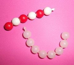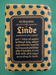 In einem Linde-Konvolut befanden sich neben verschiedenen Werbebeigaben auch diese zwei Ketten aus roten und weißen, zusammensteckbaren Perlen (Durchmesser 1 cm). Seit kurzem weiß ich, auch die waren als "Steckperlen für Armbänder und Halsketten" verpackt im Kaffee (siehe Originalpackung mit noch leserlicher Aufschrift). Vielleicht hat es auch milchig-weiße Perlen gegeben? Und auch etwas kleinere Doppelreiher in Grundfarben?