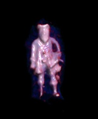 30.08.2018: In einem Konvolut fand ich diese eigenartige Figur. Nr. 5 (Rächender Geist) in dunkelrot mit kräftigen grünen Schlieren und einem mitgegossenen dunklen Haar. Siehe auch andere Fehlgüsse und Kuriositäten.